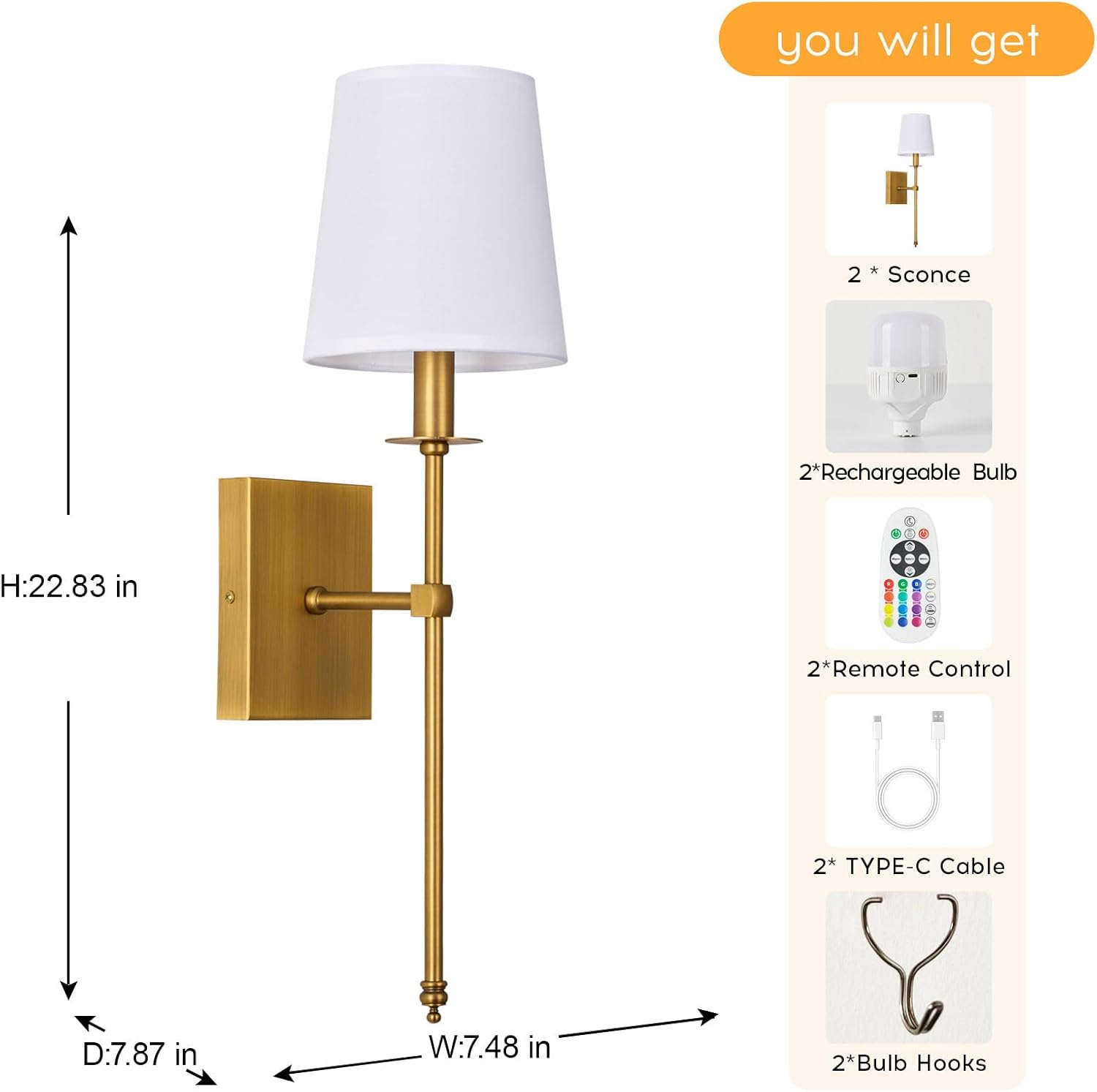 Our wireless battery operated wall lights set of 2 is designed to provide elegant, flexible, and cord-free lighting for bedrooms, living rooms, hallways, and reading spaces. Featuring a rechargeable, dimmable LED bulb with stable brightness performance, these wall sconces offer extended lighting time and effortless control through a remote. With multiple colour options, adjustable brightness levels, and a stylish minimalist brass finish, these wall lights enhance interior décor while delivering reliable and convenient illumination without the need for wiring or professional installation.