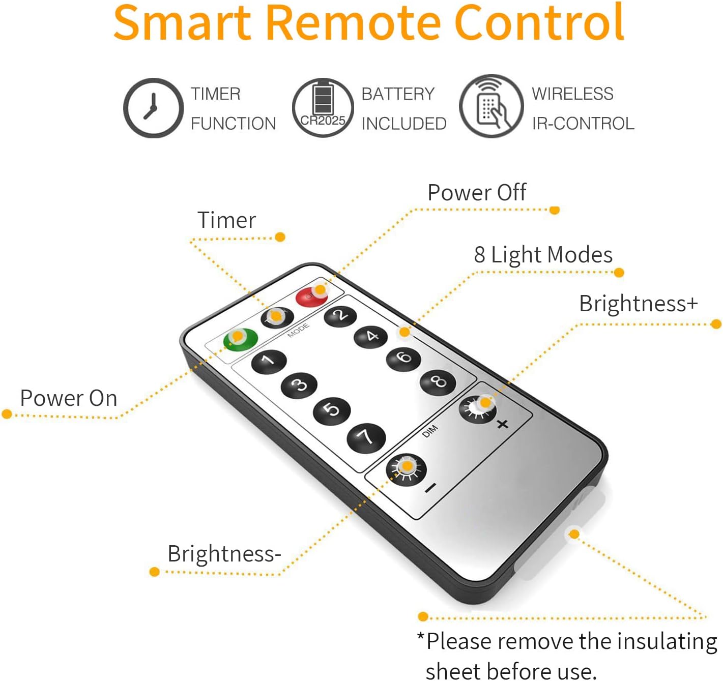 Remote control with 8 lighting modes, dimming, and timer function for easy customization