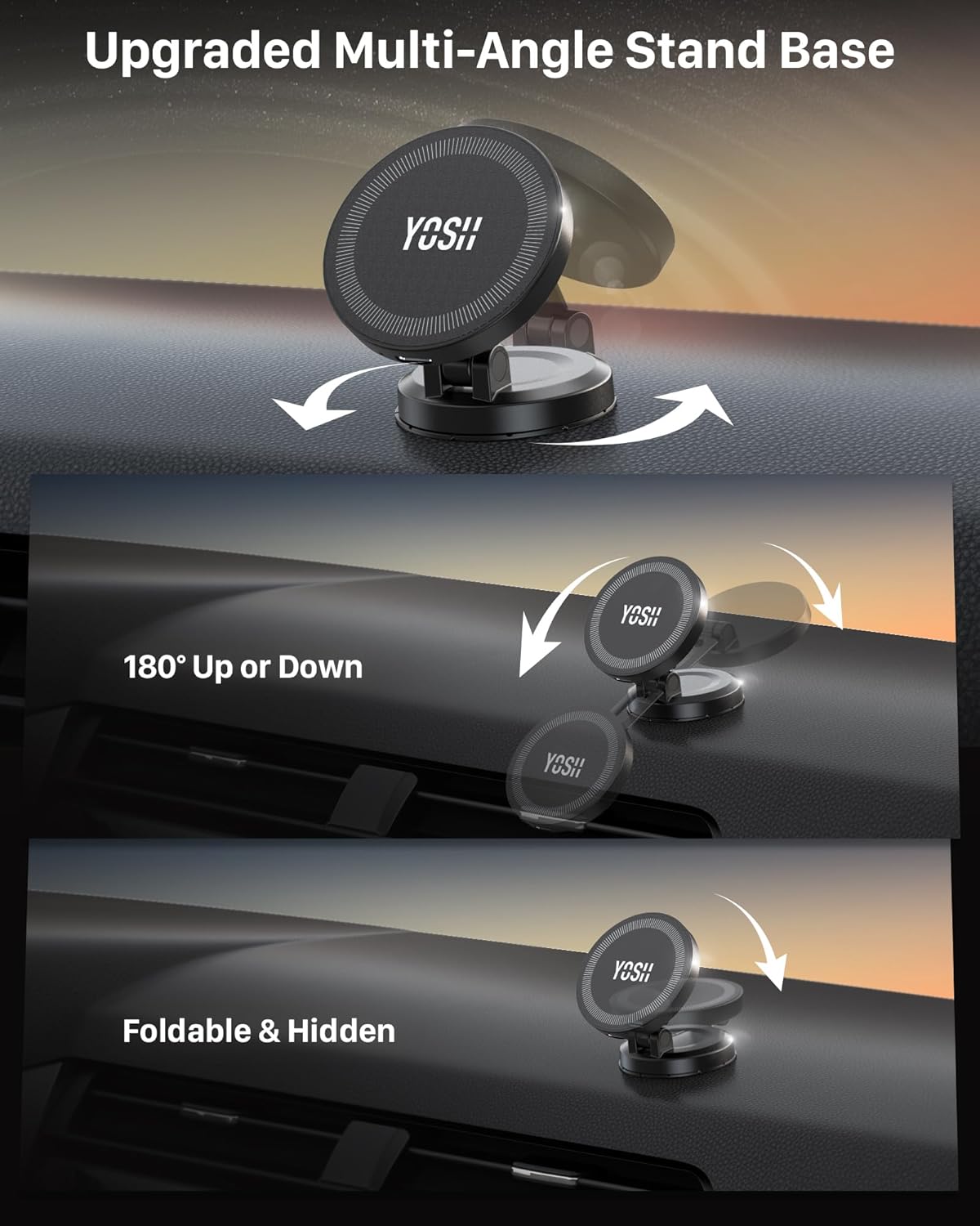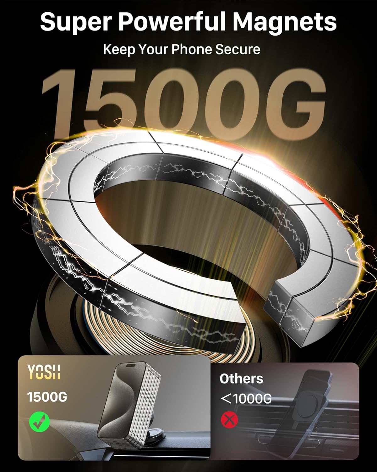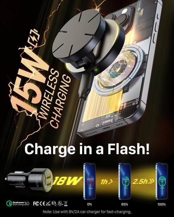 Our YOSH 15W MagSafe Car Charger Mount provides powerful magnetic stability, fast 15W wireless charging, and effortless dashboard installation for iPhone and Android users alike. Engineered with an upgraded cooling chip for superior safety, it ensures efficient heat dissipation and stable performance while driving. The genuine 3M adhesive base and 20 N55 magnets deliver exceptional grip and hold, even on uneven surfaces. Compatible with iPhone 17/16/15/14/13/12 MagSafe series and other phones using the included metal ring, it offers a reliable, clutter-free solution for fast and safe in-car charging.