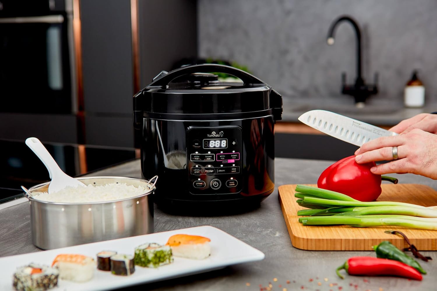 • Perfect rice at the touch of a button – Dedicated settings for white rice, long grain, short grain/sushi, and brown rice. Unique YumCarb low-carb cooking feature delivers healthier meals.