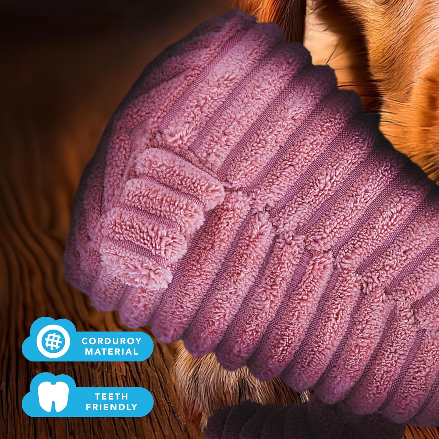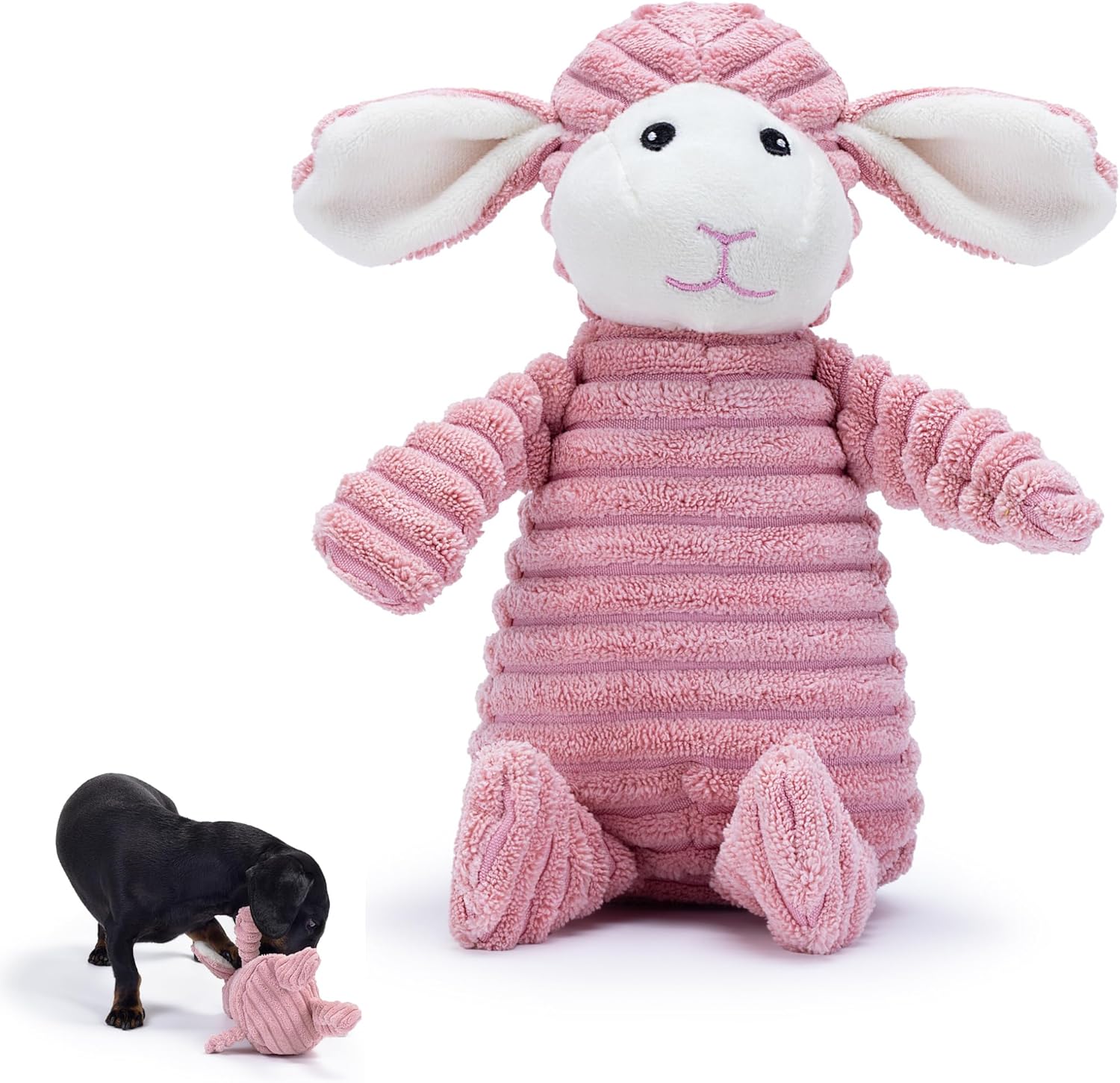 Our pink lamb plush dog toy is designed to engage your pet with its adorable lamb design, soft corduroy texture, and built-in squeaker, offering a fun, safe, and stimulating play experience for small and medium dogs.