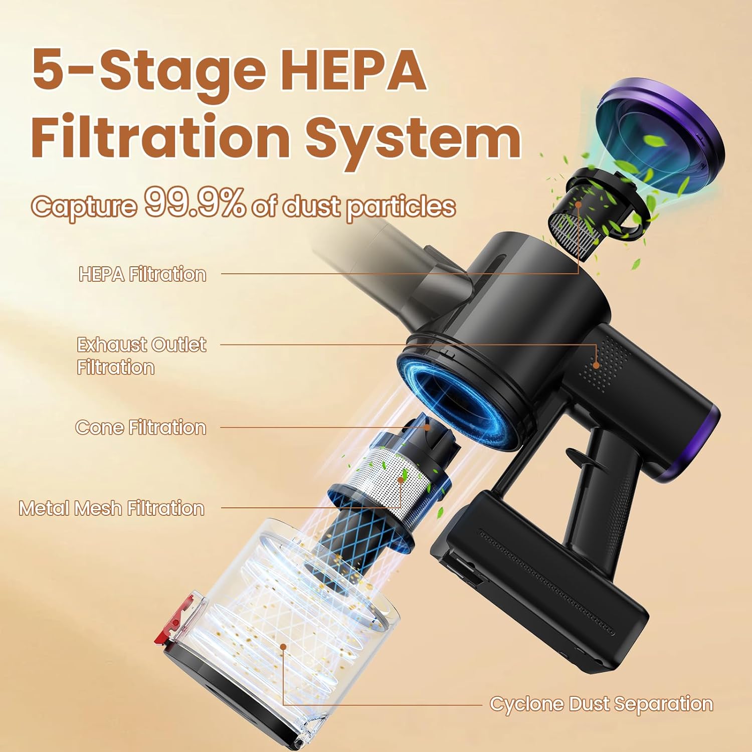 5-Layer HEPA Filtration System traps 99.99% of dust and allergens.